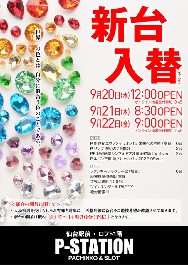 ★★明日9月20日(水)新台入替12時OPEN予定!★★