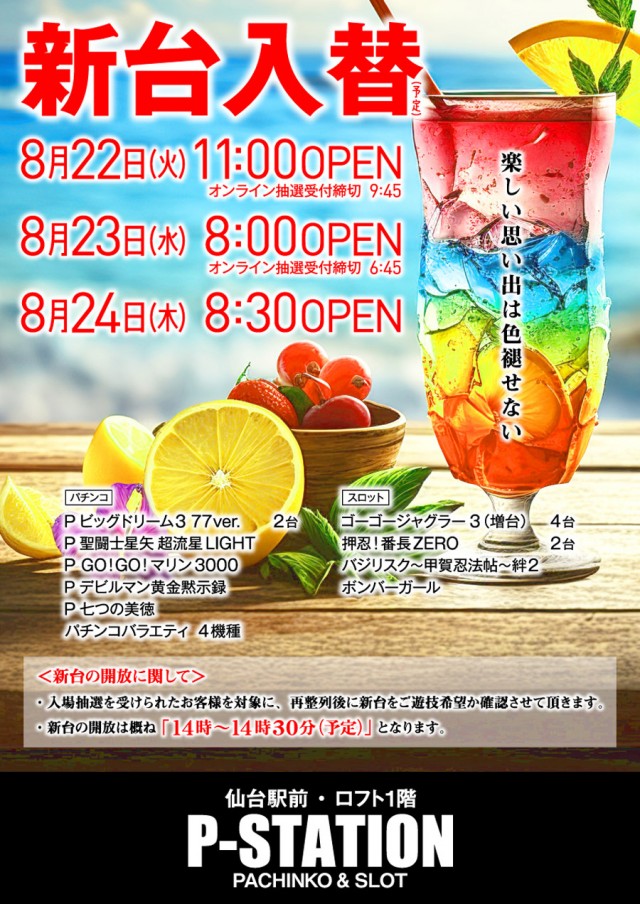 ★★本日8月22日(火)新台入替11時OPEN予定!★★