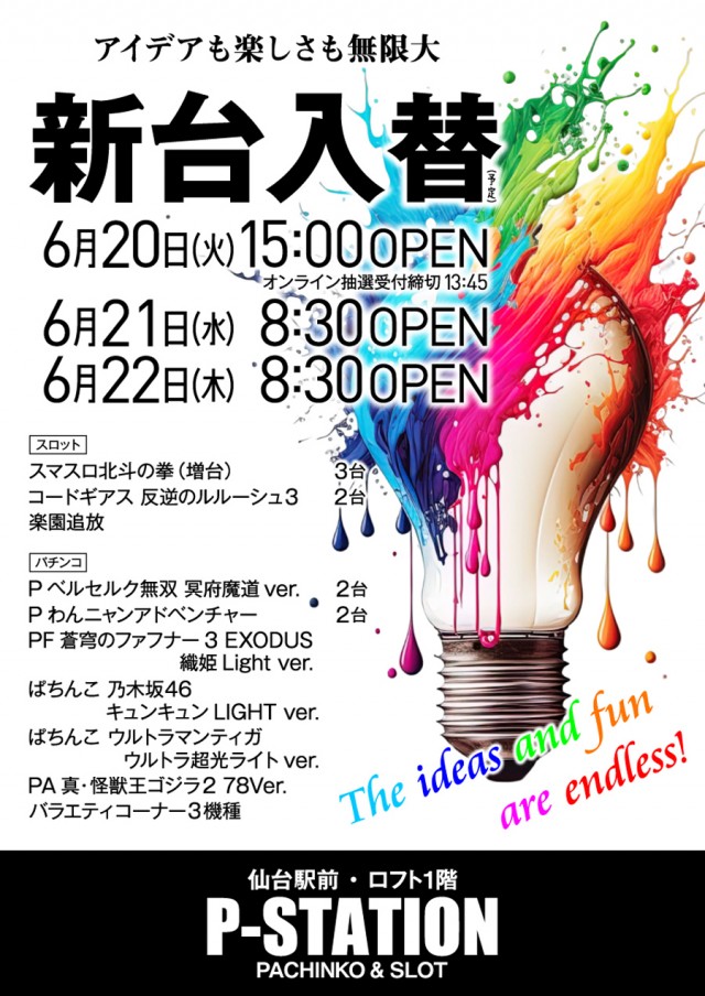★★本日6月20日(火)新台入替15時OPEN予定!★★