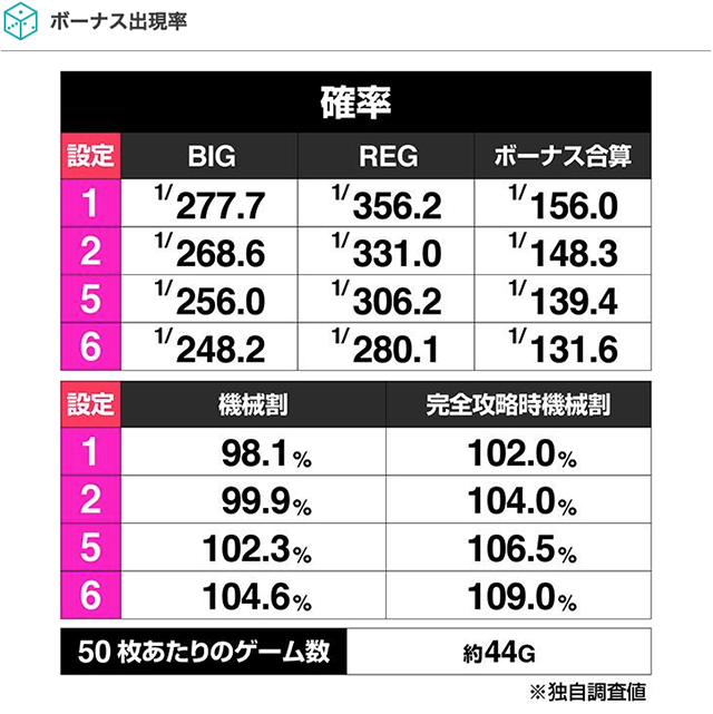 通常時の風鈴確率やRT中のハズレ確率、BIG中のバラけ目(10枚払い出し)は高設定ほど出現しやすくなっている。