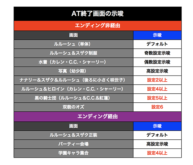 AT終了画面にも設定推測要素があり、ナナリー&スザク&ルルーシュ出現で設定2以上、双貌のオズならば設定6が濃厚だ。