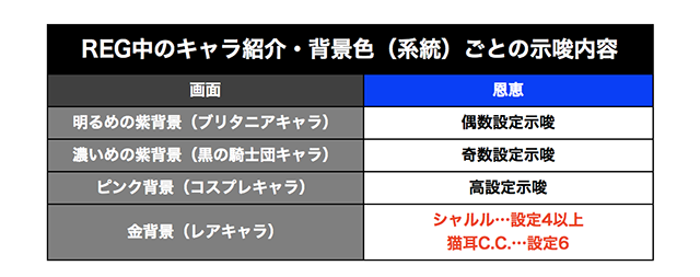 REG中はキャラ紹介の背景色で設定を示唆していて、金背景ならば設定4以上が濃厚。