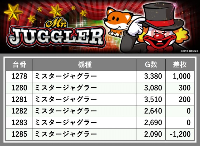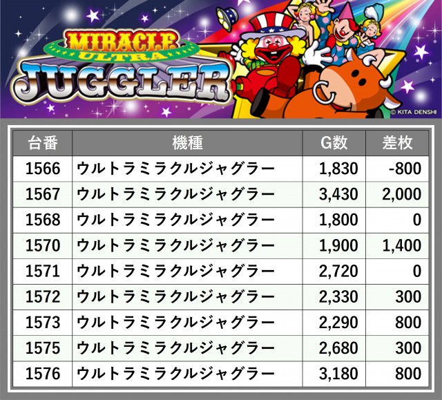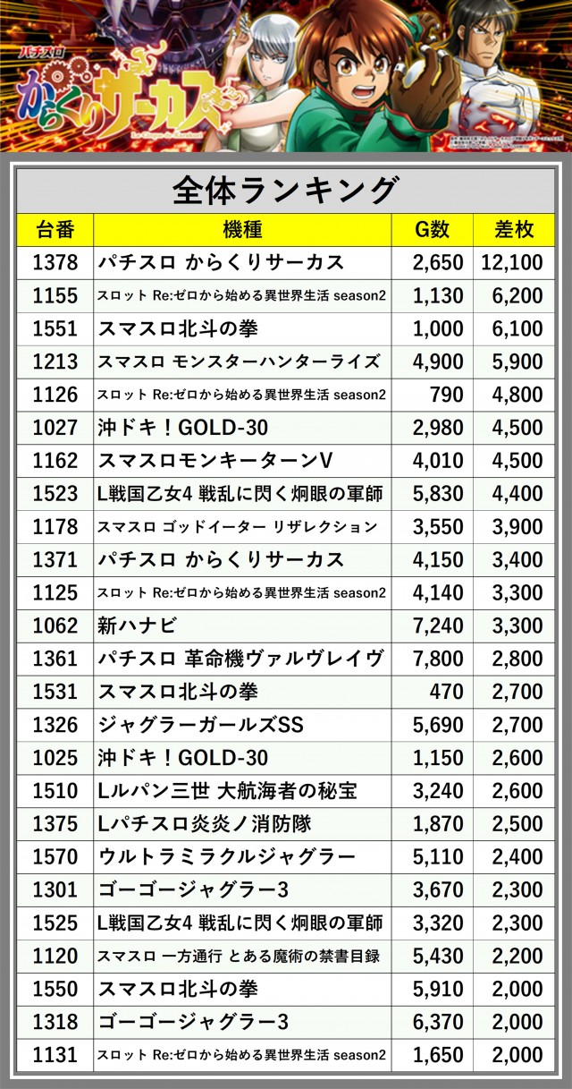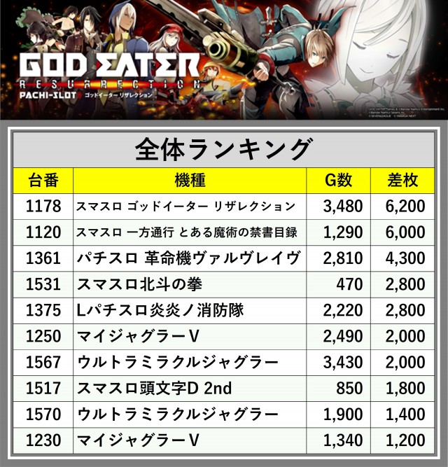 厳選された取材対象機種をはじめ、その他スロット全体から好記録が飛び出した!プレイヤーが楽しんだ1日を下記データにて振り返ってみて欲しい。
