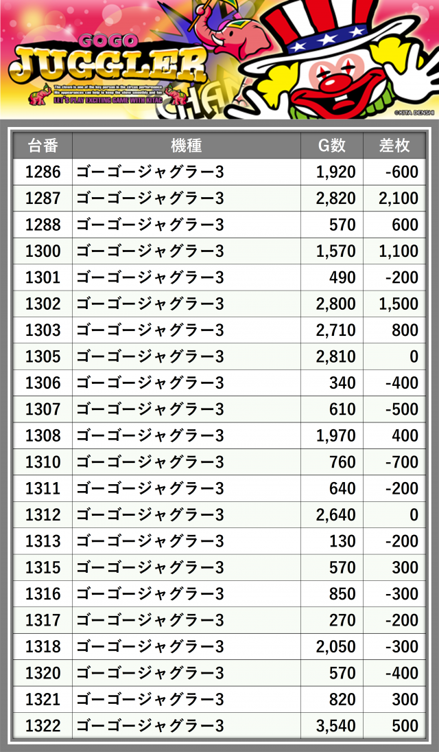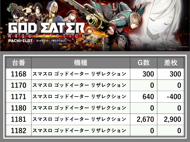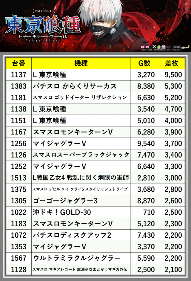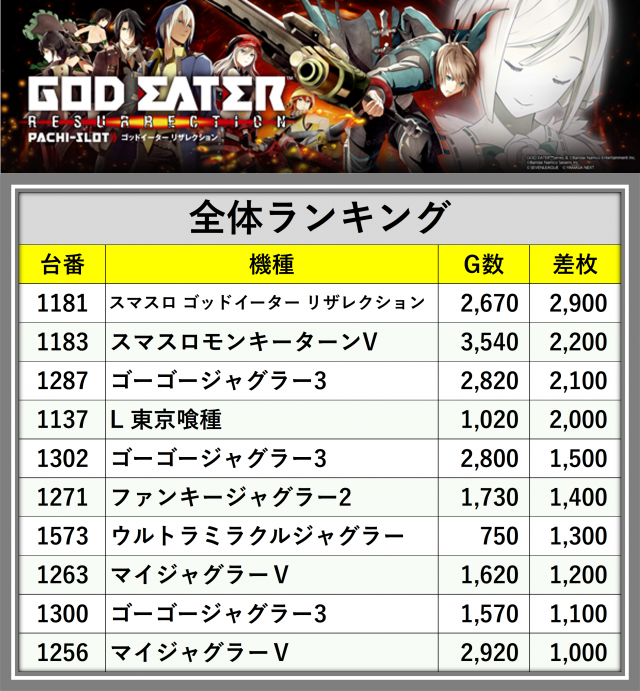 厳選された取材対象機種をはじめ、その他スロット全体から好記録が飛び出した!プレイヤーが楽しんだ1日を下記データにて振り返ってみて欲しい。
