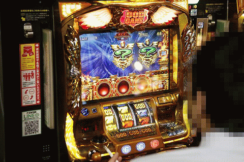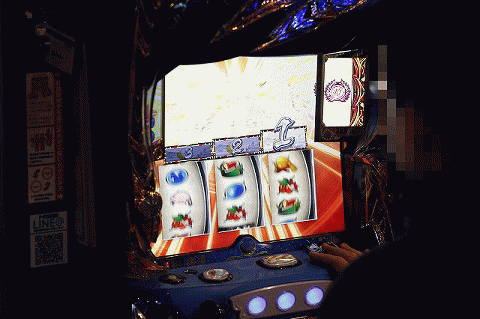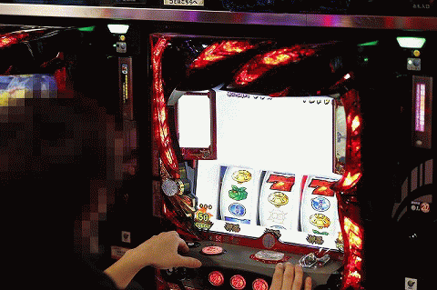 パチスロフロアで勢いよくレバーを叩く!!