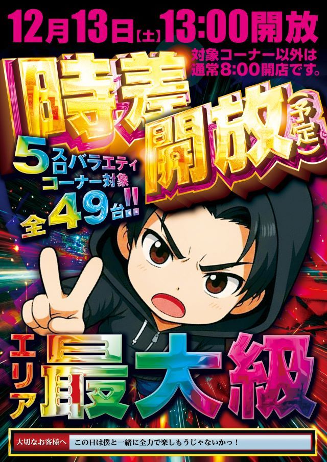 本日5スロバラエティ時差開放13時 抽選12時40分開始予定