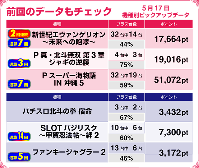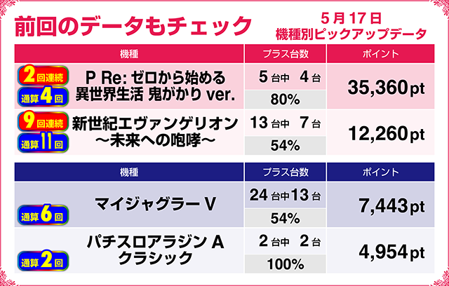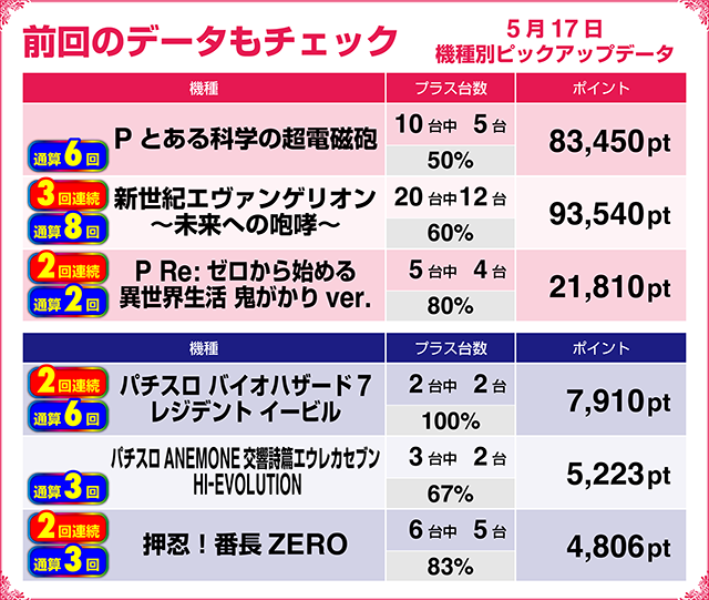 連続登場回数を更新した常連のなかには、トータルで+100,000ptを超える機種もみられた。