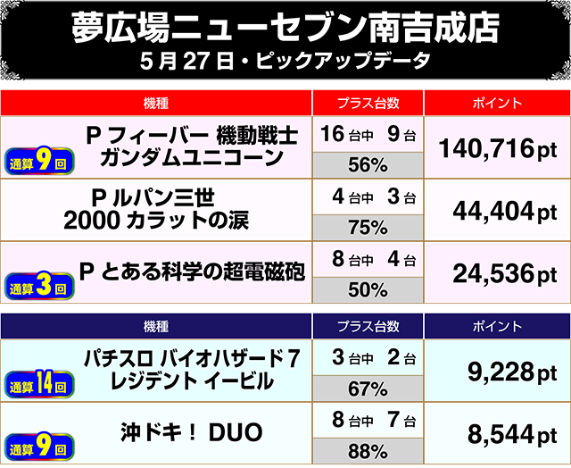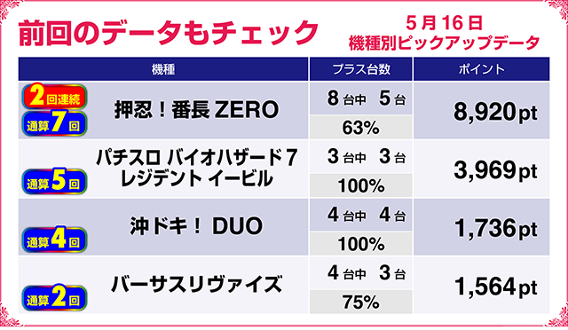 同じく、9回目のピックアップとなる『沖ドキ!DUO』も、8台中7台がプラスと好成績を残した。