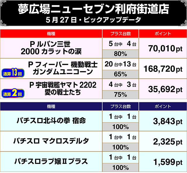 5台設置の『Pルパン三世 2000カラットの涙』は4台がプラスで、1台あたりの平均でみても+14,000ptとボリュームのある結果を残した。