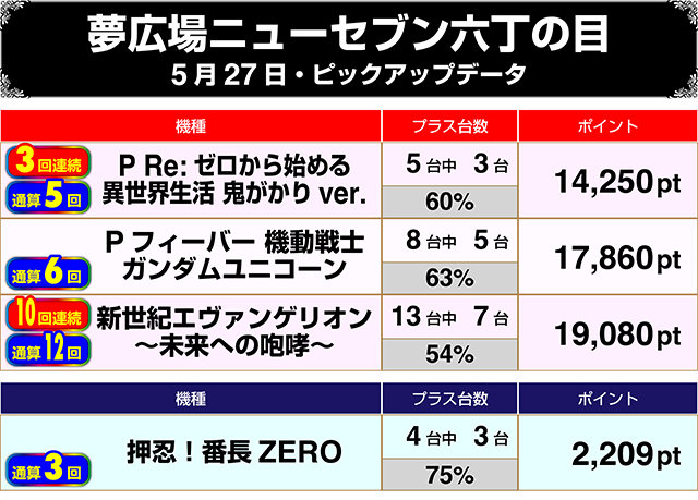 パチスロでは、4台中3台がプラスの『押忍!番長ZERO』が、今後の常連となりうるほどの活躍ぶりであった。