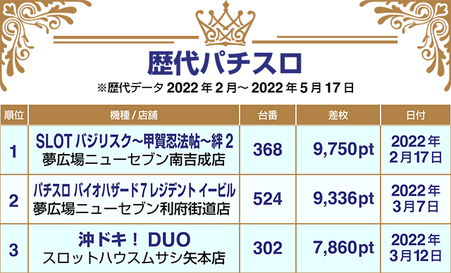 トップに輝いた『SLOTバジリスク~甲賀忍法帖~絆2』は、歴代ランキングに迫る+7,000ptオーバーを記録した。