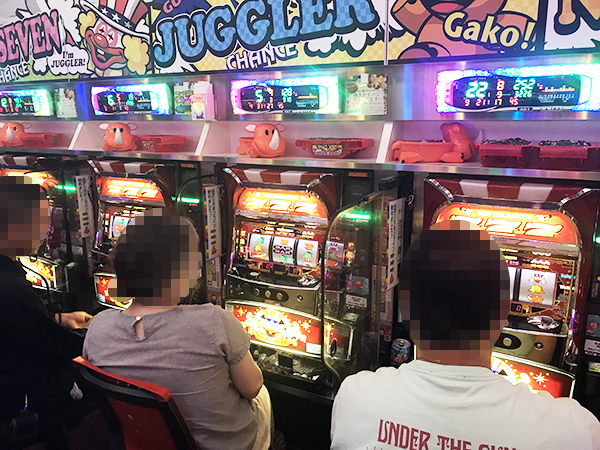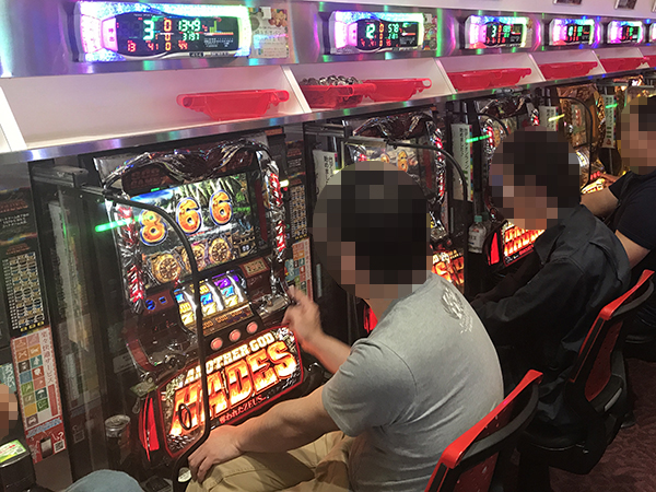20円パチスロに目を向けると、「押忍!番長3」や「アナザーゴッドハーデス-奪われたZEUSver.-」、「バジリスク~甲賀忍法帖~絆」などでプレイヤーの見事なパフォーマンスが目立っており、シマ全体に華やかな光景が広がっていた。
