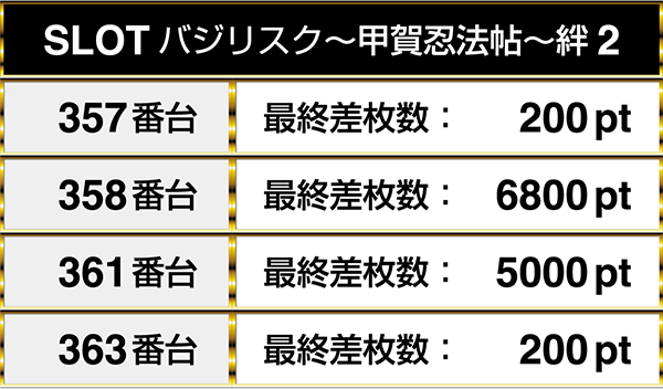 9台設置の『SLOTバジリスク~甲賀忍法帖~絆2』は4台がプラスptを記録し、2台が5000ptオーバー!!