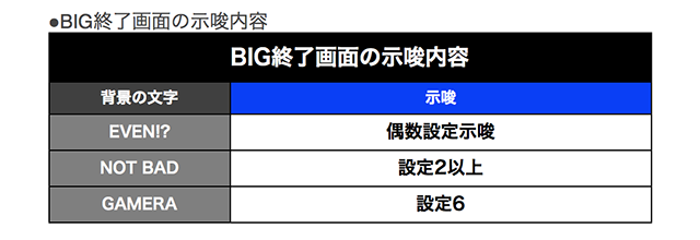 JAC中は獲得枚数表示に注目で、“456枚突破”が表示されれば設定4以上が濃厚。BIG終了画面では背景に文字が表示されれば、特定の設定が濃厚となる。