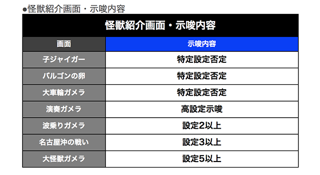 REG中は紹介される怪獣で設定を示唆しており、波乗りガメラなら設定2以上、大怪獣ガメラなら設定5以上が濃厚だ。