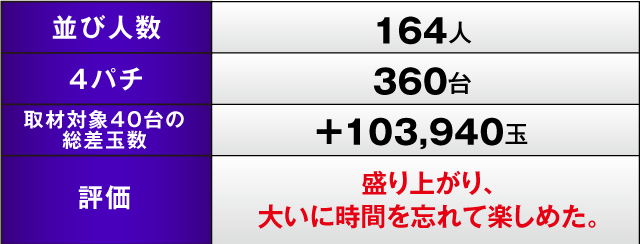 今回も取材班がピックアップしたのは『P牙狼 月虹ノ旅人』&『ぱちんこCR真・北斗無双』計40台。この40台の総差玉は前回より下がってしまったものの、それでも+10万玉をマーク。ニブイチでプラス台となっていたのもなかなかの好結果と言えるだろう。