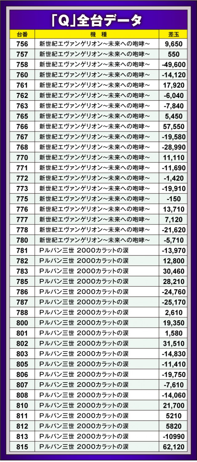 早速、この日の取材対象となった40台をチェック。対象となった『新世紀エヴァンゲリオン〜未来への咆哮〜』と『Pルパン三世 2000カラットの涙』コーナーでは多くの優秀台が出現していたが、『エヴァ』からはプラス5万玉オーバー、『ルパン三世』からはプラス6万玉オーバーという驚きの結果を残しており、取材班を含め多くのファンが羨望の眼差しで見ていた。