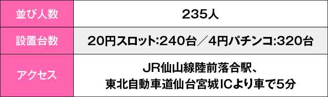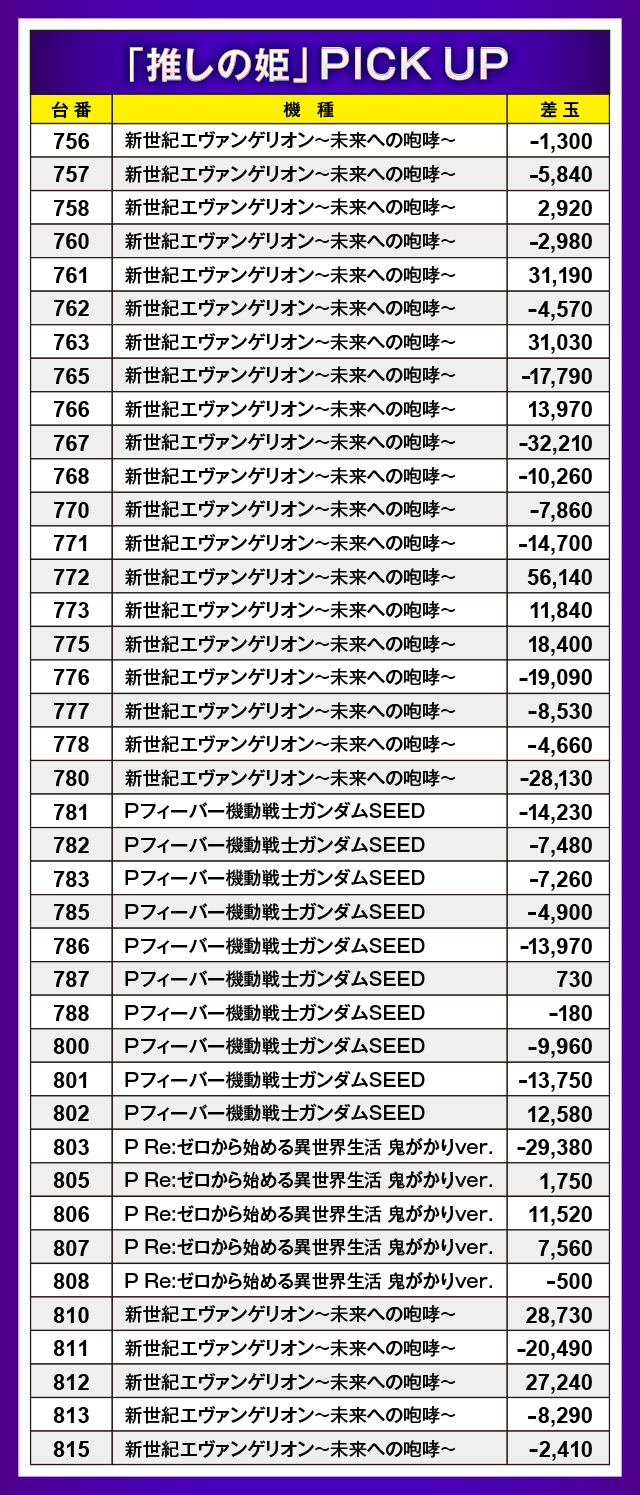 初の「推しの姫」取材だったが、その結果はどこに出しても恥ずかしくないものだったと言えるだろう。パチンココーナーには力の入ったボックスが出現し、『新世紀エヴァンゲリオン~未来への咆哮~』を中心に10,000玉超えのレコードを複数散見。パチスロコーナーでは『L戦国乙女4 戦乱に閃く炯眼の軍師』が凄まじい勢いを見せ、内1台が13,000枚オーバーを果たした。また、取材班がわかっているだけで3台並びの仕掛けを4箇所も確認。その他にもまだあったかもしれない。いずれにしろ、「並び」「塊」を意識した立ち回りが正解だったのは間違いないようだ。