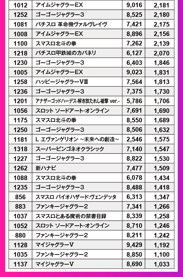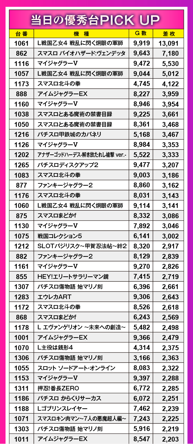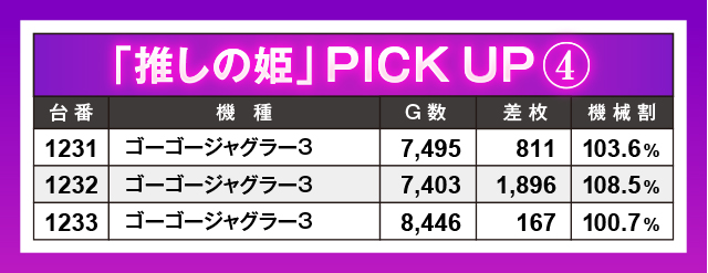 記念すべき第1回「推しの姫」取材日の首位記録に立ったのは13,091枚というトンデモレコードを叩き出した『L戦国乙女4 戦乱に閃く炯眼の軍師』。同機は4台設置のうち3台が上位20位内にランクインするという大活躍っぷりを披露してくれた。また最新マシンに混じって『ジャグラー』シリーズも数多くランクインしており、定番マシンも抜かりなしの態勢だったことを証明!