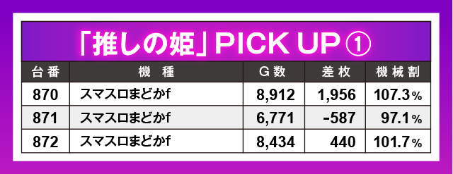 『スマスロ劇場版 魔法少女まどか☆マギカ[前編]始まりの物語/[後編]永遠の物語f-フォルテ-』コーナーにて、3台並びっぽい挙動を確認。残念ながら1台はマイナスとなってしまったが、優秀台のニオイはプンプン…!