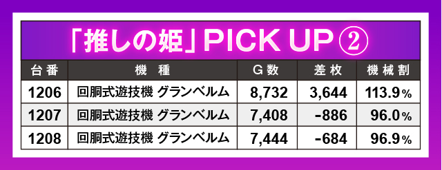思うような結果にならなかったのが『回胴式遊技機 グランベルム』。しかし1206番台は優秀台としての本領を発揮し、3,500枚オーバーを達成した!