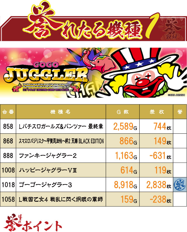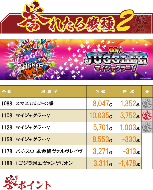 こちらのブロックも末尾8の台の結果を集計。3台並んで誉マーキング、さらに『マイジャグラーⅤ』から4,000枚に届きそうな勢いの台が出現!これは怪しい…。