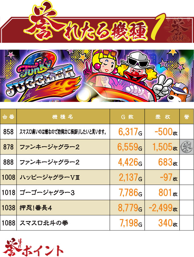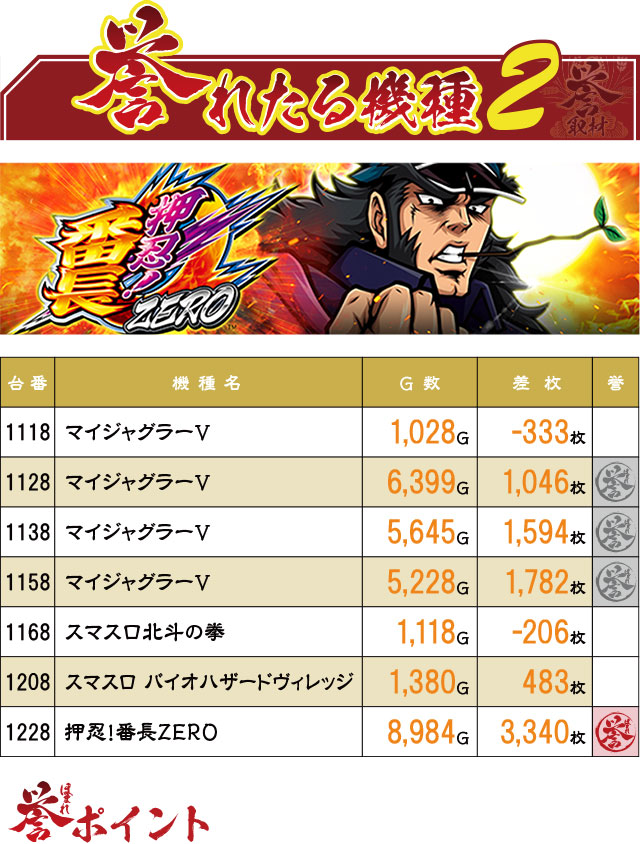こちらの末尾⑧の台では、『マイジャグラーⅤ』と『押忍!番長ZERO』に誉マーキングが。しかしこちらのブロックでも総ゲーム数の少ない台がマイナスとなっており、仕掛けに気付きにくい状況だったかも…。
