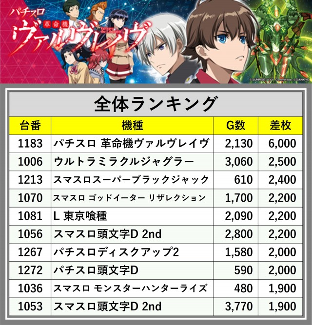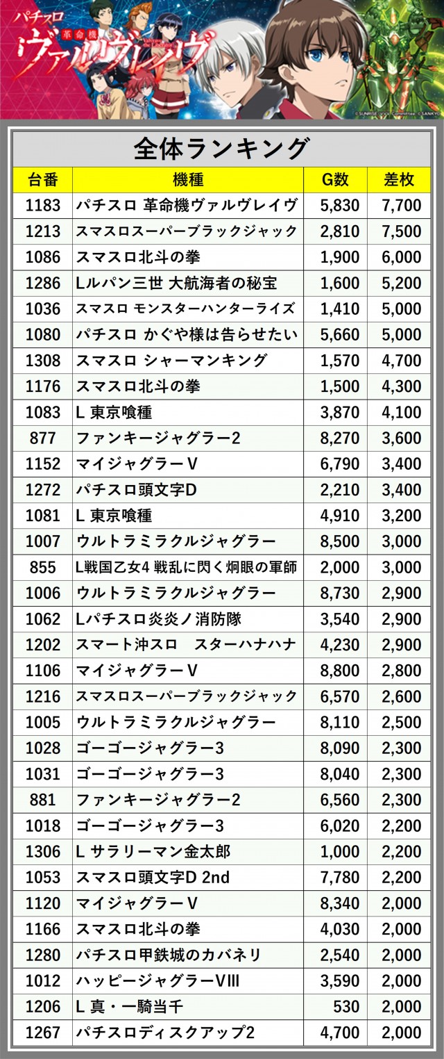 厳選された取材対象機種をはじめ、その他スロット全体から好記録が飛び出した!プレイヤーが楽しんだ1日を下記データにて振り返ってみて欲しい。