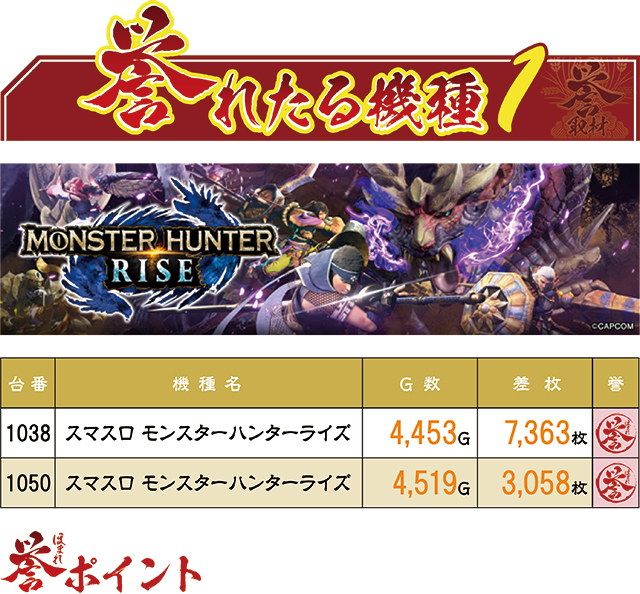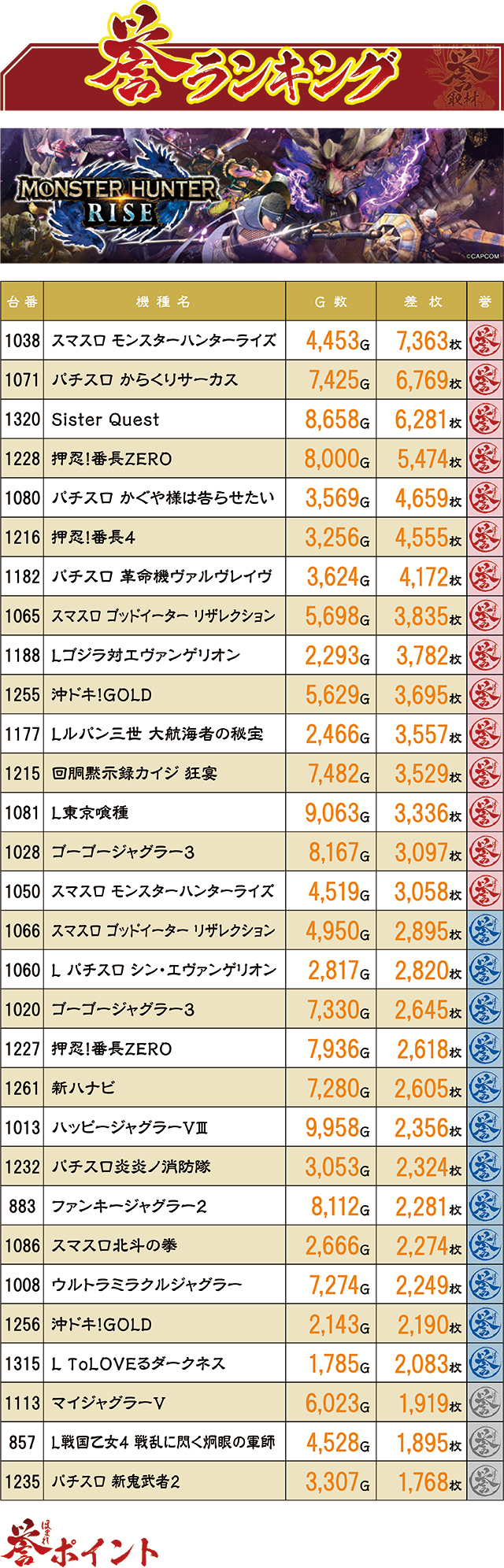 『スマスロ モンスターハンターライズ』が7,000枚を超える好記録で、誉ランキングの頂点に。またこの日は新台の動きも活発で、3位には『Sister Quest』、12位には『回胴黙示録カイジ 狂宴』がそれぞれランクインし、ベテラン勢を脅かす活躍を見せてくれた。