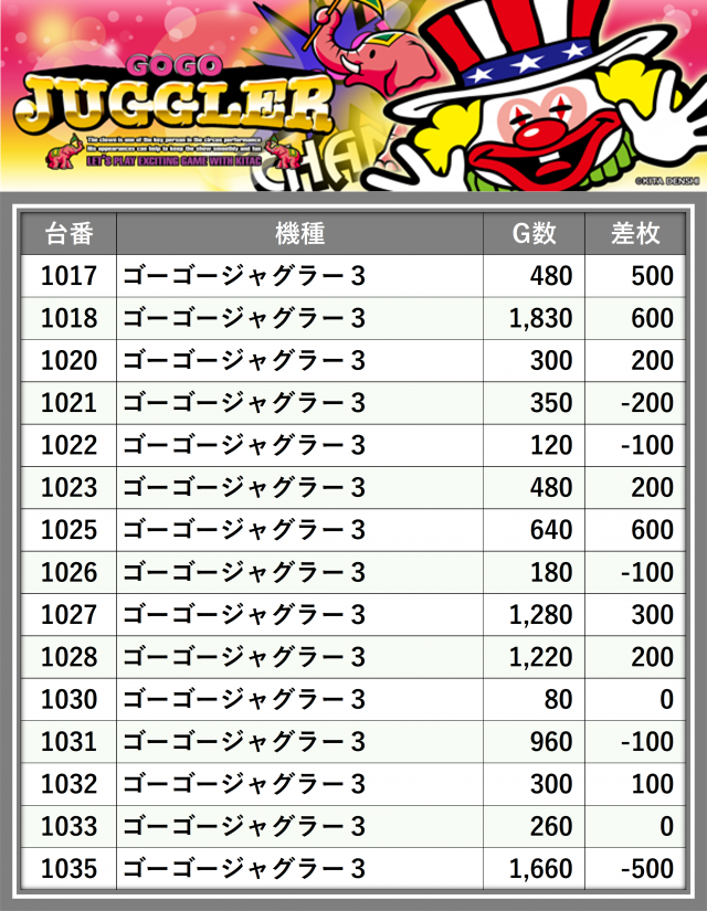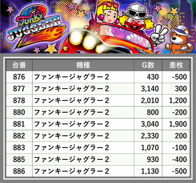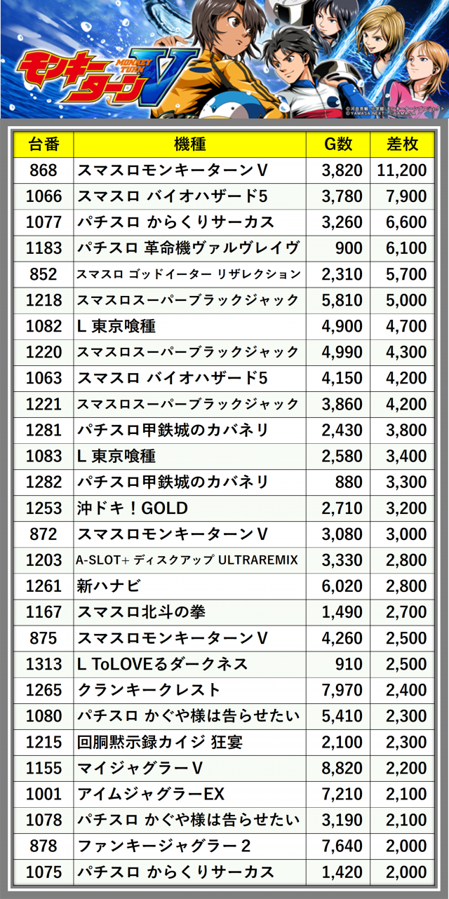厳選された取材対象機種をはじめ、その他スロット全体から好記録が飛び出した!プレイヤーが楽しんだ1日を下記データにて振り返ってみて欲しい。