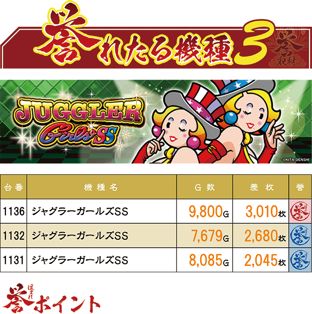 この日『ジャグラー』シリーズの中で最も輝きを放っていたのは『ジャグラーガールズSS』。設置5台のうち、3台が青誉マーク(=2,000枚以上)&赤誉マークとなっており、『ジャグ』にも十分なチャンスがあることを証明してくれた。