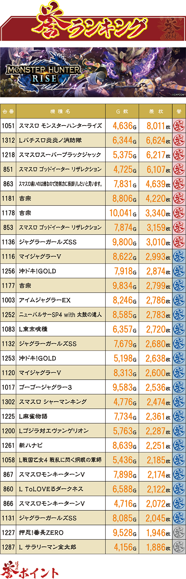 今回8,000枚オーバー記録でトップ差枚となったのは『スマスロ モンスターハンターライズ』。次いで『Lパチスロ炎炎ノ消防隊』『スマスロスーパーブラックジャック』などの人気機種が並ぶが、注目は少し前に新台導入された『吉宗』が3台もランクインしていたことだろう。