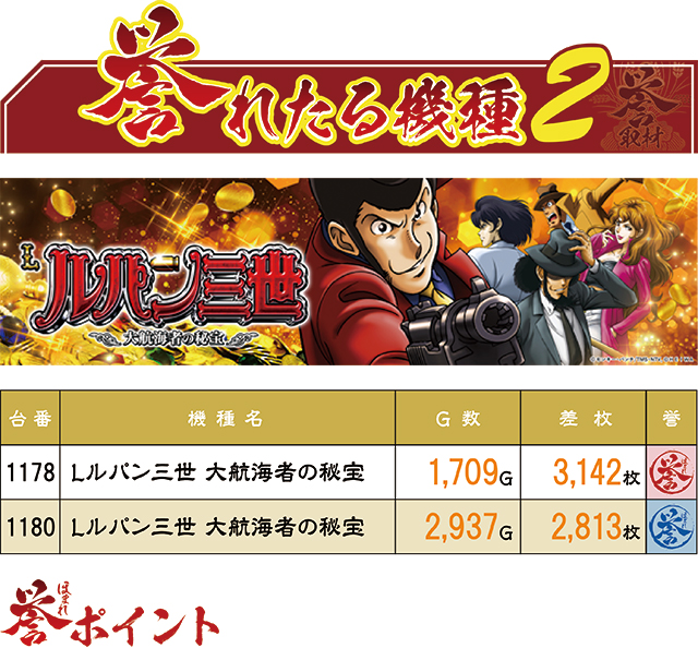 『Lルパン三世 大航海者の秘宝』は、2台設置で2台ともが誉レコード(=1,000枚以上)という納得の結果に。ただし2台とも総ゲーム数が少なく、フル稼働していたらどこまで差枚を伸ばしていたのだろうか。