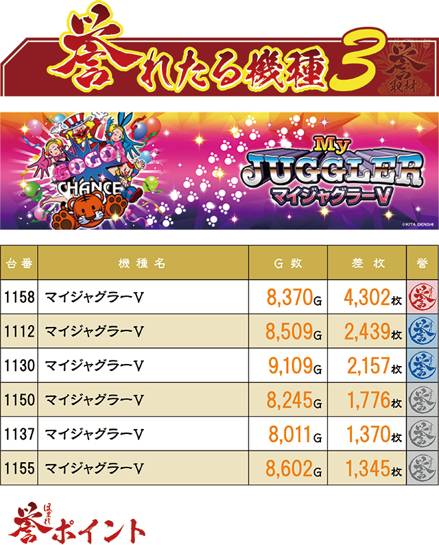 ジャグラーファンの期待に応え、6台が誉レコードとなった『マイジャグラーⅤ』。中でも1158番台の快進撃っぷりは凄まじく、終わってみれば4,000枚を突破するほど突き抜けた結果となった。