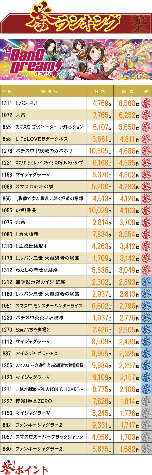 2台が赤誉マーク(=3,000枚以上)となっていた『吉宗』。残念ながら首位レコードは『Lバンドリ!』に譲ったが、1072番台が6,000枚超えを達成し、満足のいく結果を生み出していた。