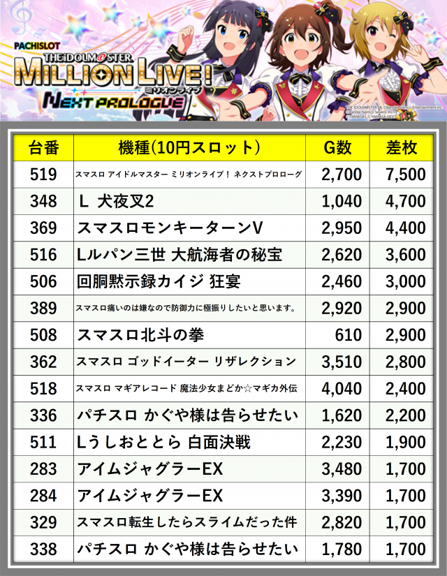 ※差枚数順に掲載しています