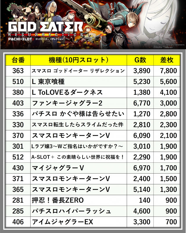 ※差枚数順に掲載しています