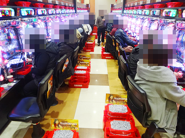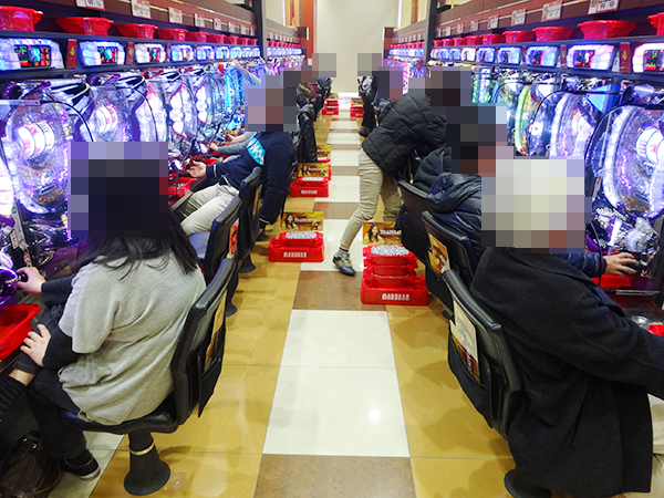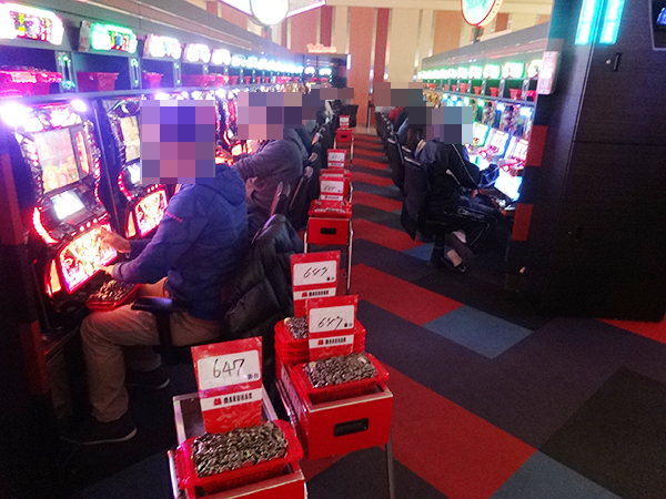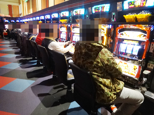 パチンコ・パチスロコーナーは終日にわたり盛り上がりをみせ、とくにパチスロのシマから大きなにぎわいが感じられた「マルハン仙台新港店」。