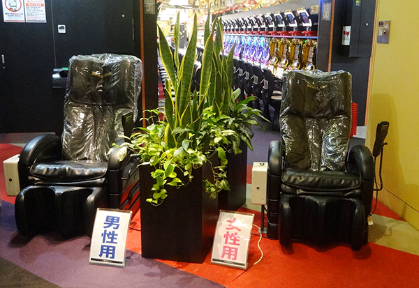 気軽に利用できる休憩コーナーには男性用と女性用で分けられたマッサージチェアが設置されており、幅広いプレイヤーへの配慮がなされていた。