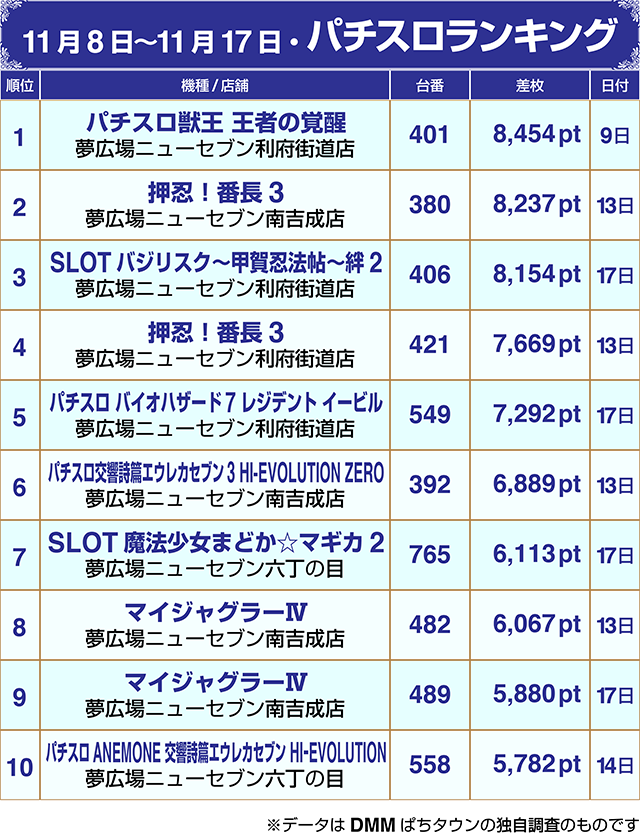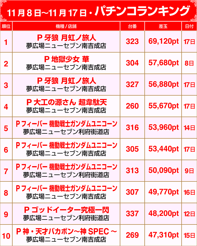 日刊ぱちタウンで、夢広場ニューセブングループの11月8日~17日までの10日間に迫る!!