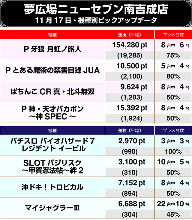 パチンココーナーでは、『P牙狼 月虹ノ旅人』の平均差枚数が+20,000ptに迫る圧倒的な好成績を残した。