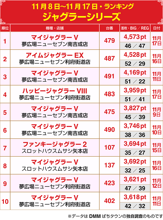 『マイジャグラーV』も機種全体で+6,000ptと大きなプラスとなった。