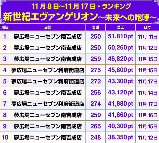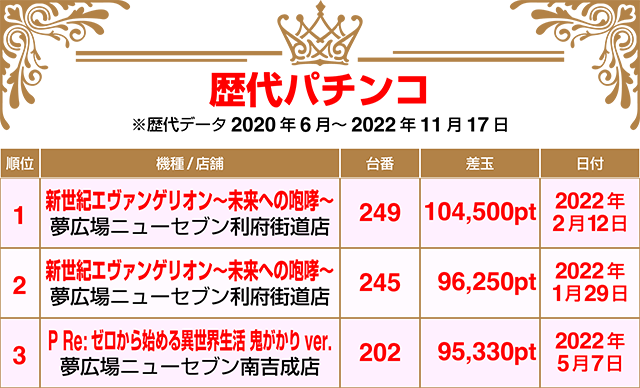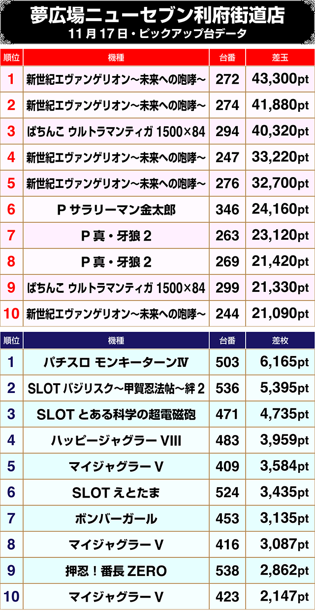 設置台数の多いジャグラーシリーズと、『新世紀エヴァンゲリオン~未来への咆哮~』を中心に、たくさんの機種に魅力的な結果が並んだ。