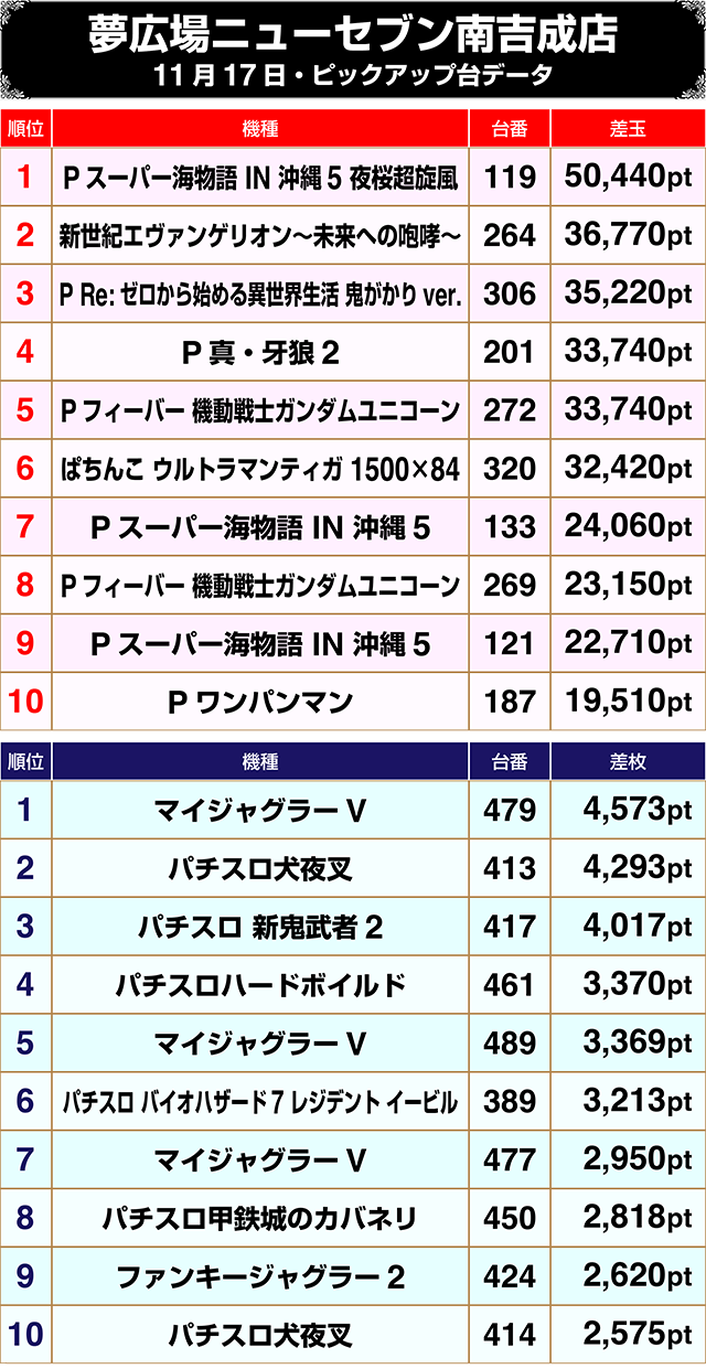 『Pスーパー海物語 IN 沖縄5』の支持率も高く、トータルで+16,960ptとなった。