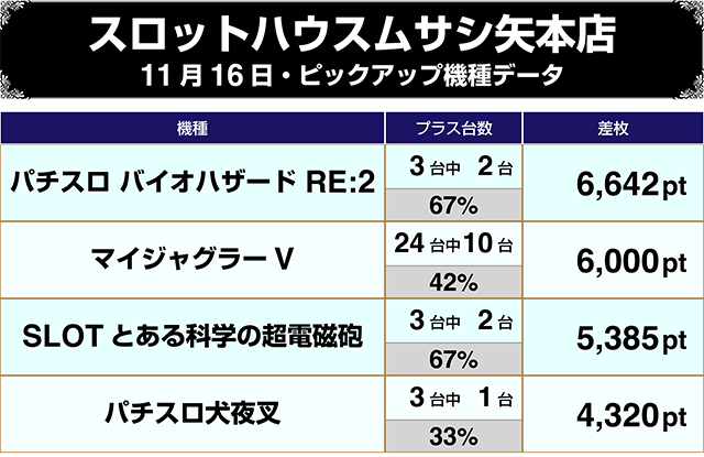 【11/16スロットハウスムサシ矢本店をピックアップ】