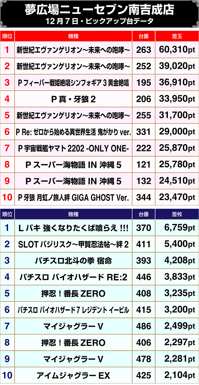 定番のジャグラーシリーズと『新世紀エヴァンゲリオン~未来への咆哮~』にも好記録が多数!