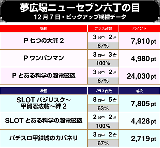 2台がともにプラスの『SLOTとある科学の超電磁砲』、8台中5台がプラスの『SLOTバジリスク~甲賀忍法帖~絆2』も目立った成績を残した。