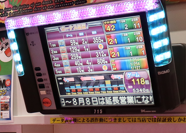遊技を満喫しているような姿だけでなく、5340G消化でボーナス当選回数が42回の台も目にした。
