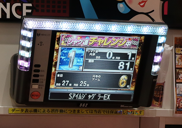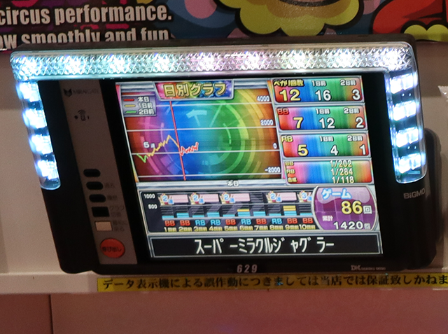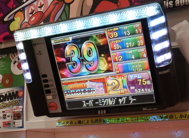 18時頃の『スーパーミラクルジャグラー』では、ボーナス当選回数が39回の台を確認。