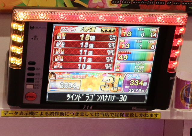 『ツインドラゴンハナハナ-30』には、3379Gを消化した時点でボーナス当選回数が31回の台があった。